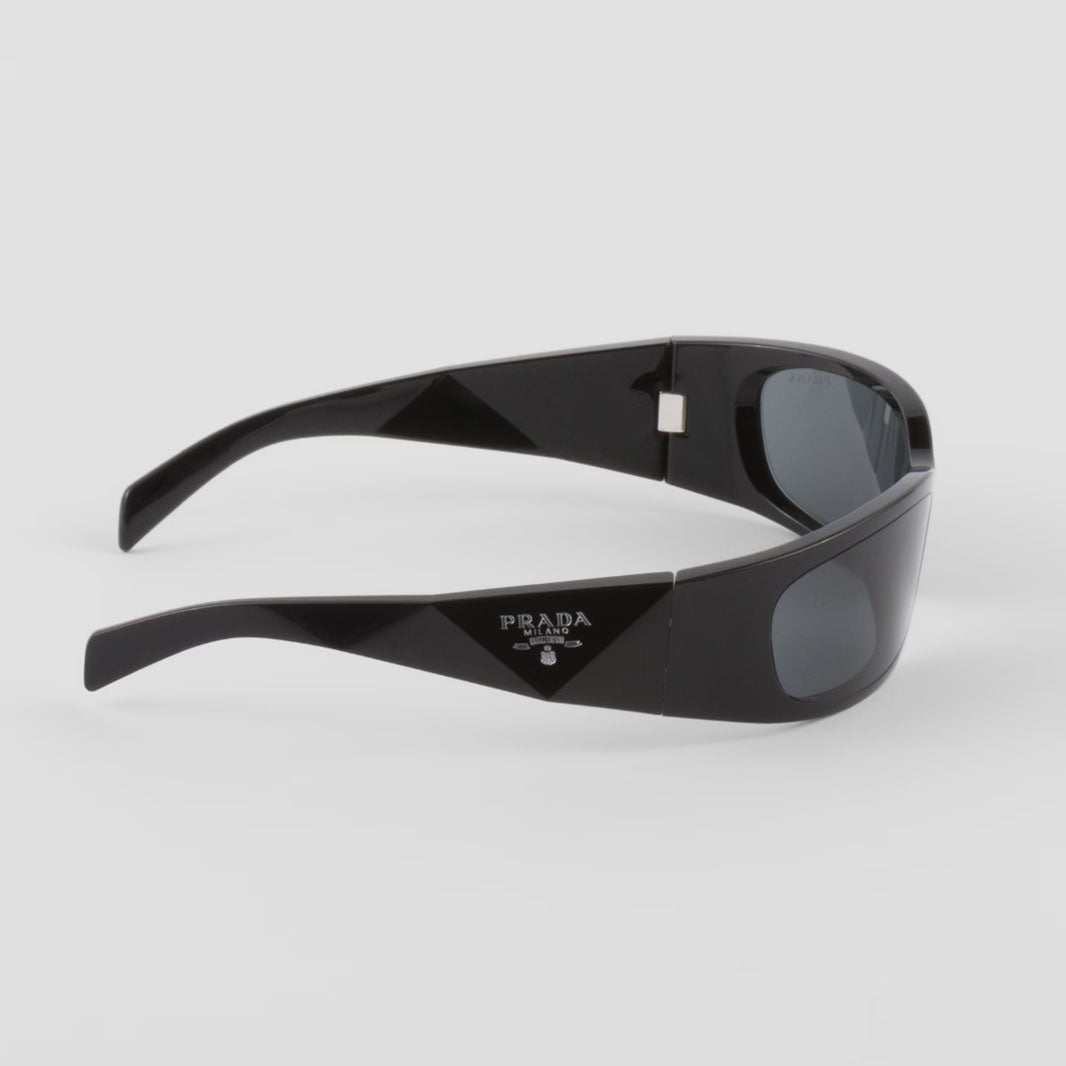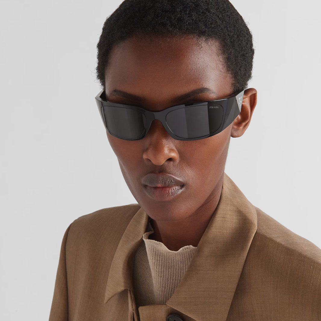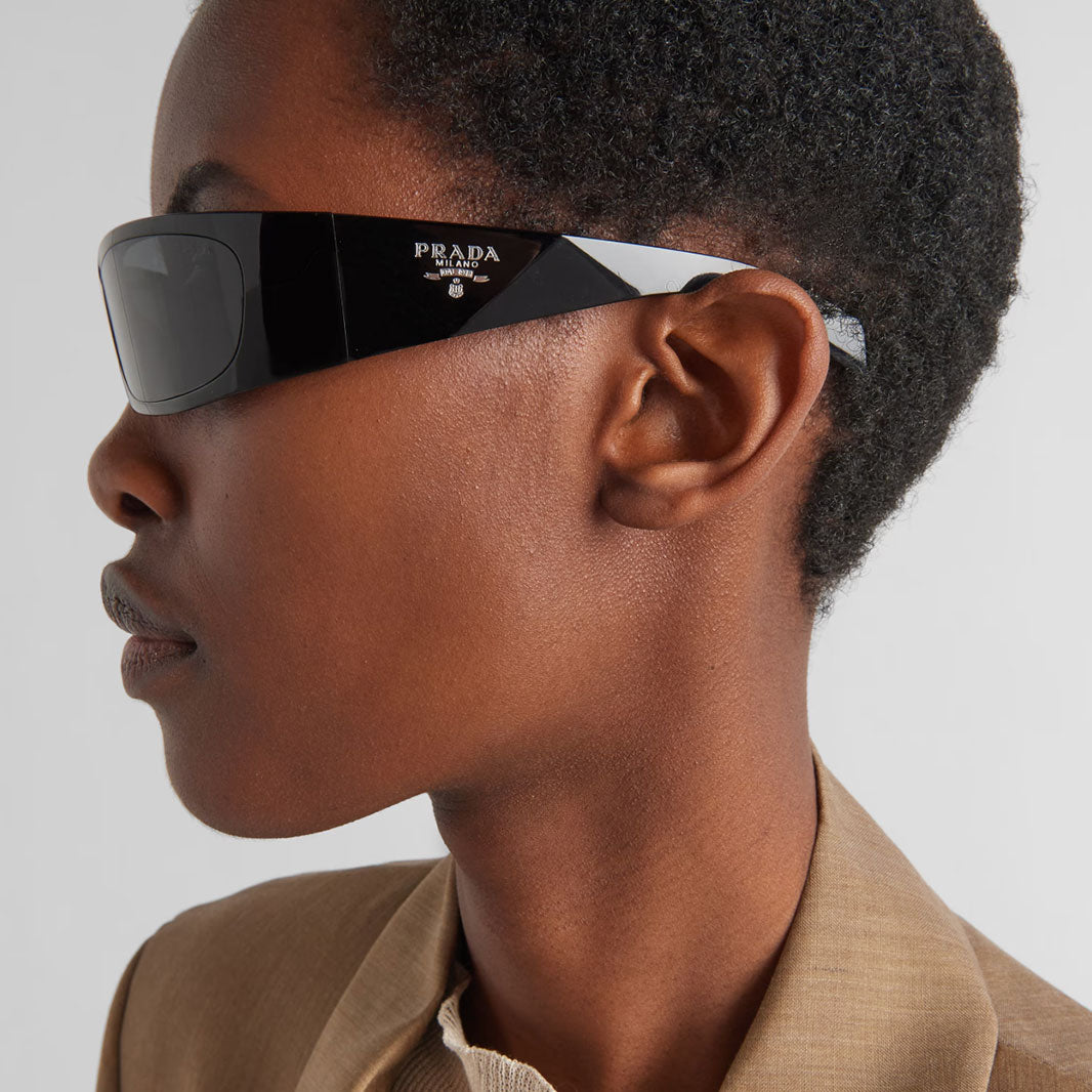 Prada eyewear represents the perfect balance of innovation, elegance, and refined style. This futuristic wraparound model features a bold black acetate frame with sharp geometric details and dark lenses, enhanced by the Prada logo on the temples. Since 1913, Prada has been a global symbol of luxury and avant-garde design — a statement piece for those who value Italian excellence and distinctive fashion.