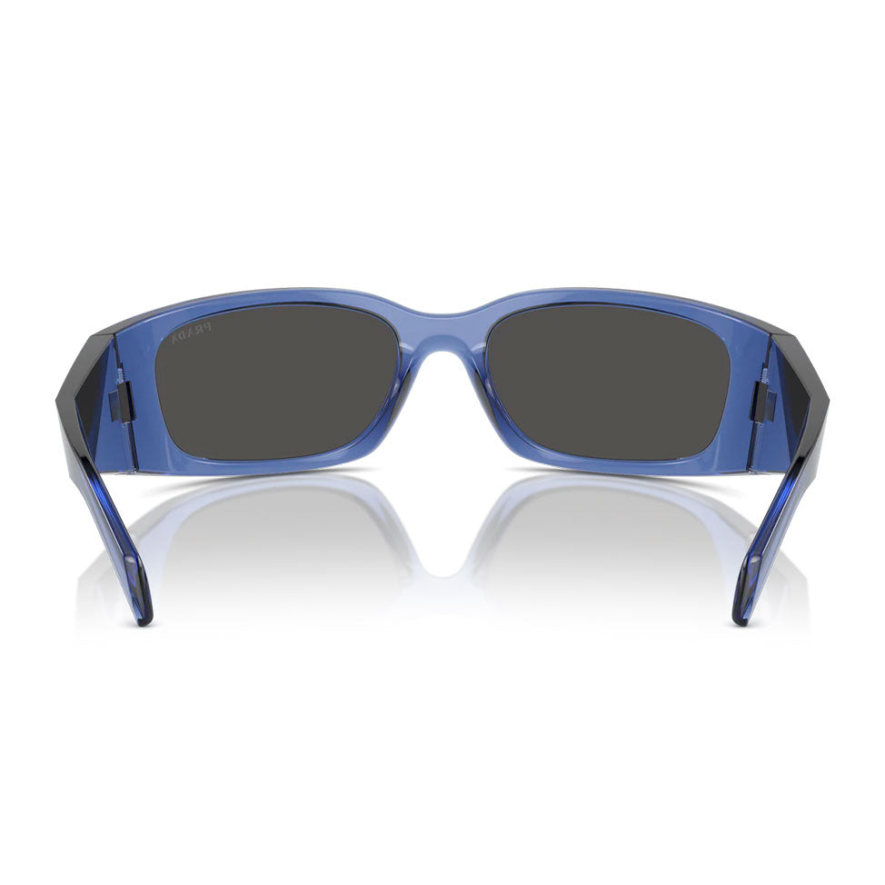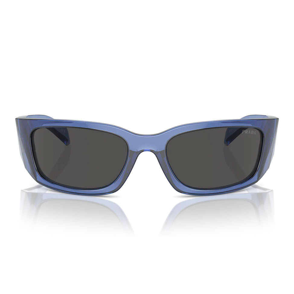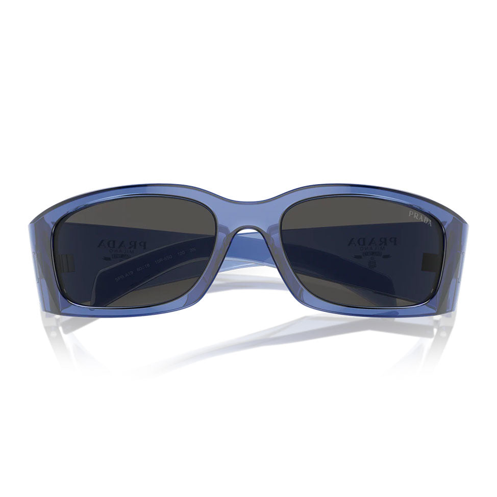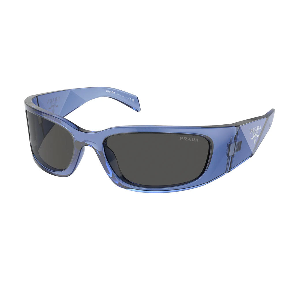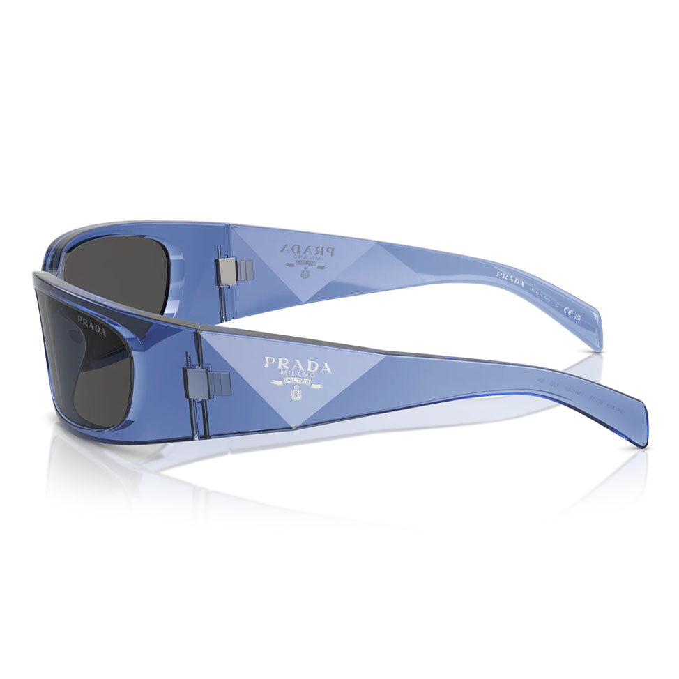 Prada eyewear represents the perfect balance of innovation, elegance, and refined style. Since its foundation in Milan in 1913, Prada has become a global symbol of luxury and avant-garde design. This model features a bold wraparound acetate frame in transparent blue with sleek dark gray lenses, offering both functionality and striking aesthetics. The sporty yet elegant design is enhanced by the Prada logo on the temples, making it the ideal choice for those who appreciate true Italian excellence and want to stand out with a modern, fashion-forward accessory.