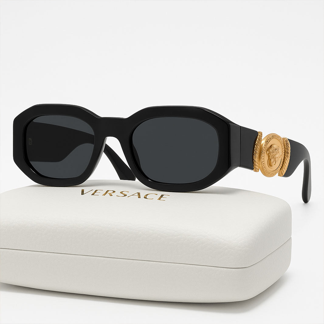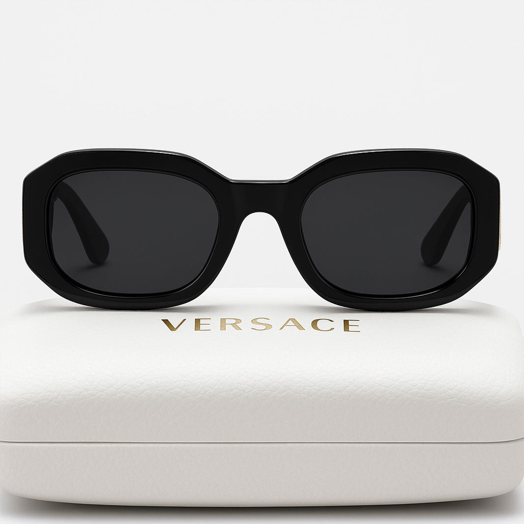 Versace eyewear is a bold expression of glamour, power, and Italian luxury. This statement model features a black acetate frame with dark lenses, highlighted by the gold Medusa emblem on the temples — an unmistakable Versace signature. Designed for those who embrace confidence, opulence, and unapologetic style, these sunglasses are the perfect fusion of prestige and fashion-forward attitude.
